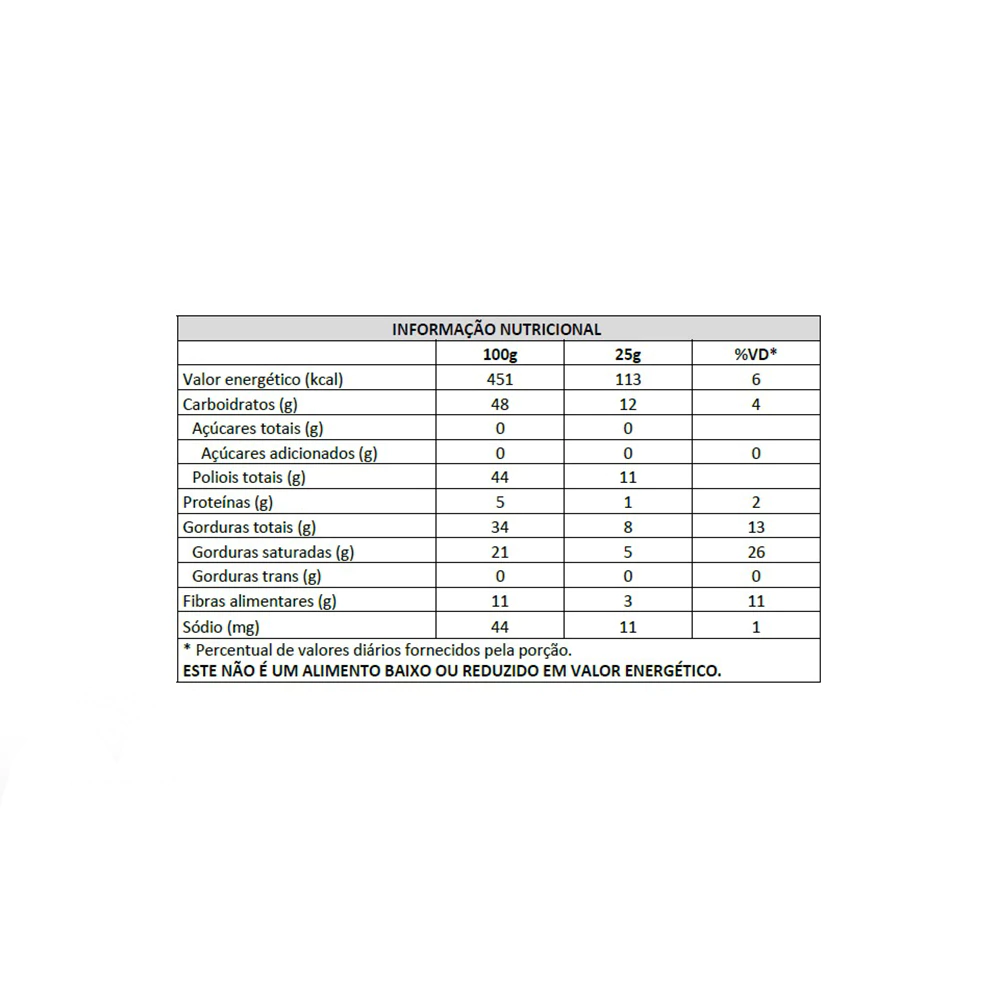 Ingredientes: Massa de cacau, manteiga de cacau, cacau em pó, sal, extrato natural de baunilha, edulcorante maltitol, espessante polidextrose e emulsificante lecitina de girassol. NÃO CONTÉM GLÚTEN. NÃO CONTÉM LACTOSE