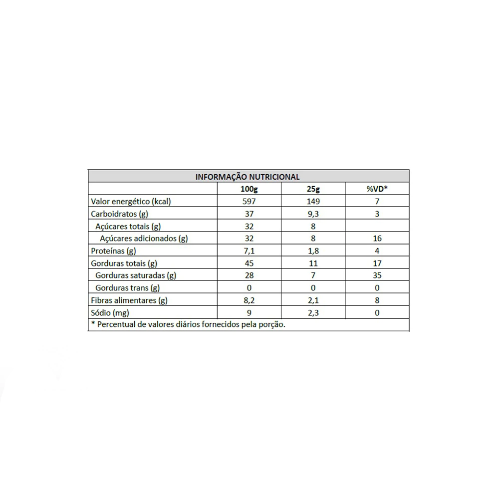 Ingredientes: Massa de cacau, açúcar, manteiga de cacau, extrato natural de baunilha e emulsificante lecitina de girassol. NÃO CONTÉM GLÚTEN. NÃO CONTÉM LACTOSE.